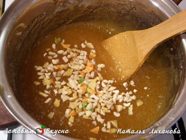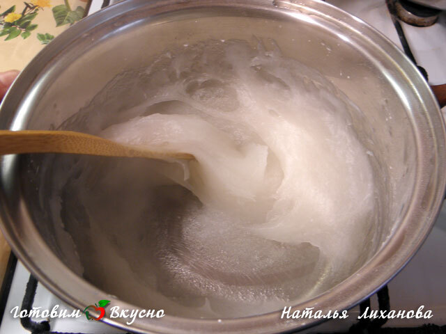 В крахмальную смесь тонкой струйкой вливаем сироп, все время мешаем смесь. Доводим до кипения и варим до тех пор, пока масса станет прозрачной и однородной. Мешаем массу постоянно, так как она будет расслаиваться. Выключаем огонь, если есть добавки, добавляем их и перемешиваем (я добавляла фруктово-ореховую смесь).