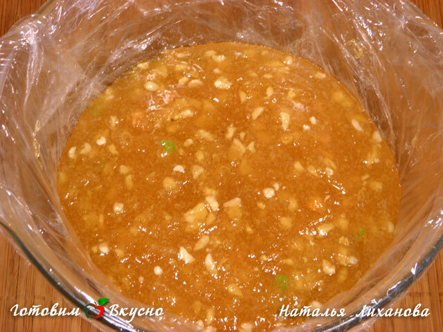 Выливаем массу в подготовленную форму, накрываем пищевой пленкой и оставляем в прохладном месте на 4-6 часов, а лучше на ночь.