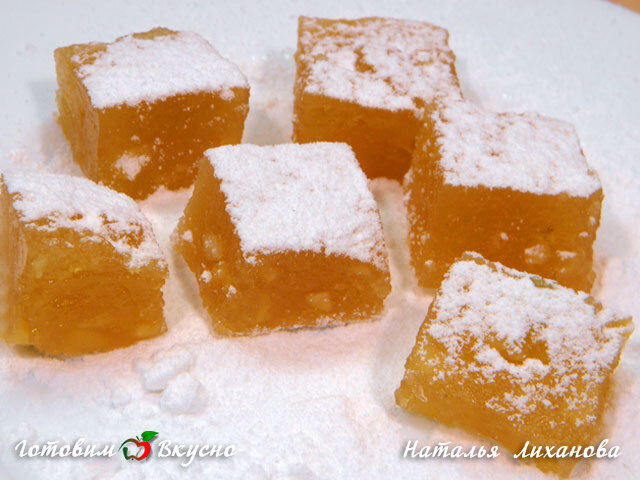 Застывший лукум достаем из формы и нарезаем квадратами. Сахарную пудру и крахмал просеиваем через сито, лукум обваливаем в сахарно-крахмальной смеси. Перекладываем рахат-лукум в банку и храним в закрытой емкости.