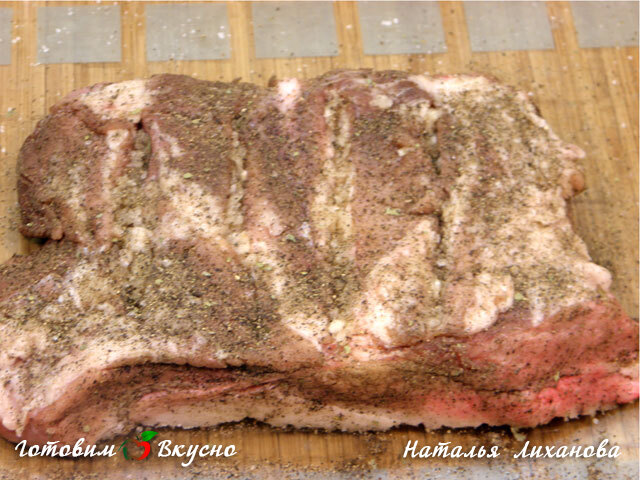 Чеснок трем на терке или пропускаем через пресс. Перец и лавровый лист измельчаем в кофемолке или перетираем в ступке. Тщательно солим сало со всех сторон, щедро посыпаем смесью перца и лаврового листа. На сале делаем продольные надрезы и укладываем в них чеснок.