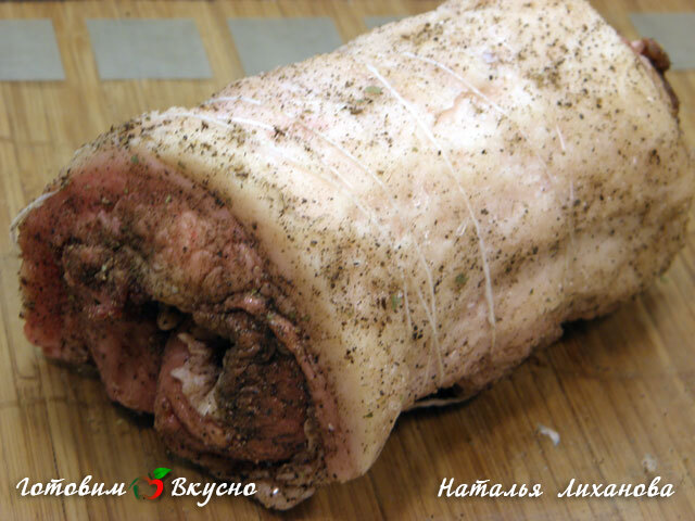 Сворачиваем сало рулетом и перевязываем кулинарной нитью.