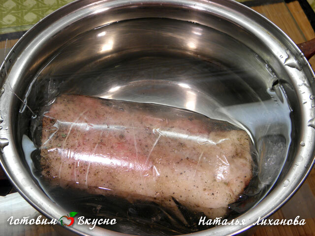 Рулет в рукаве погружаем в кастрюлю с водой и закрываем крышкой. После момента закипания варим рулет на небольшом огне около 2-х часов.