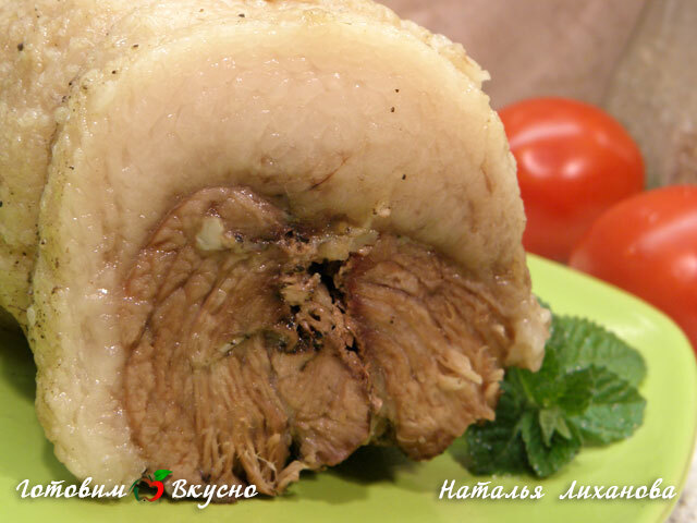 Готовый рулет из брюшины выкладываем на тарелку и охлаждаем . Подаем рулет из брюшишы как холодную закуску с горчицей, хреном и т. д. Приятного аппетита!