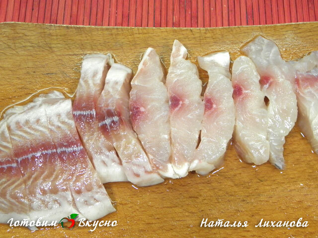 Рыбу нарезаем на кусочки толщиной примерно 1 см.