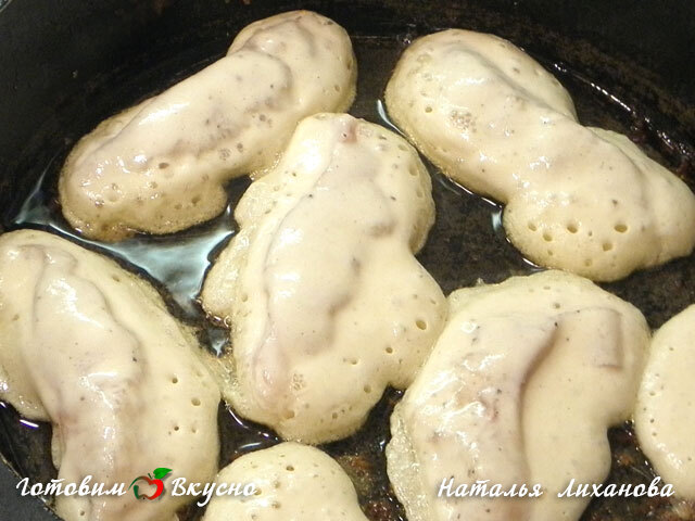 Каждый кусочек рыбы окунаем в кляр и выкладываем на разогретую с маслом сковороду. Обжариваем с двух сторон до румяной корочки.
