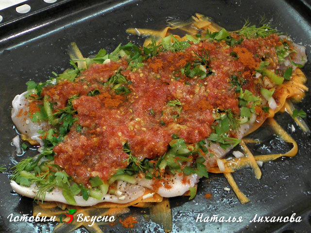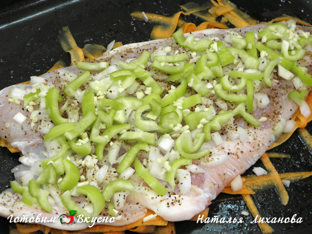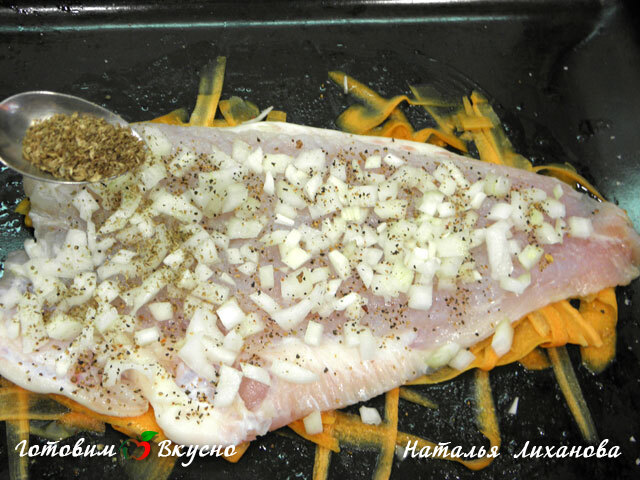 Сверху моркови выкладываем рыбу, на нее выкладываем мелко нарезанный лук, присыпаем перцем и кориандром.
