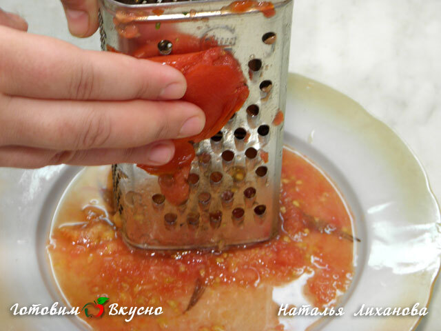 Подготовим помидоры для рыбы, запеченной с овощами и сыром. Срезаем немного шкурки на помидоре и срезанной стороной трем его на крупной терке. Таким образом, мы натрем мякоть, а шкурка останется у нас в руках.