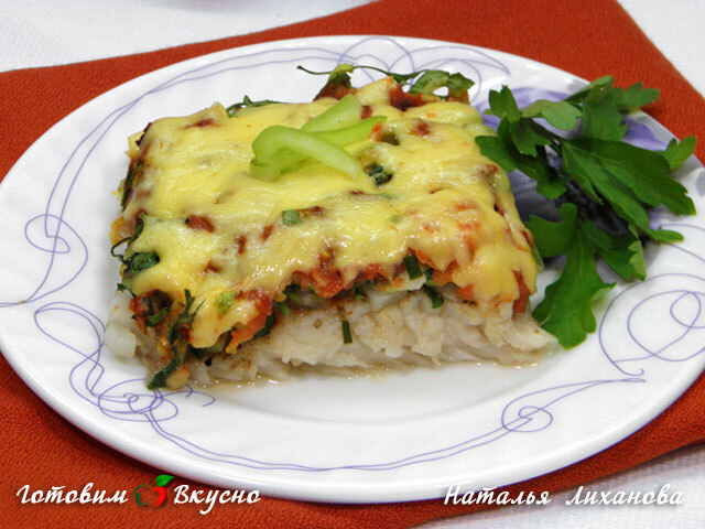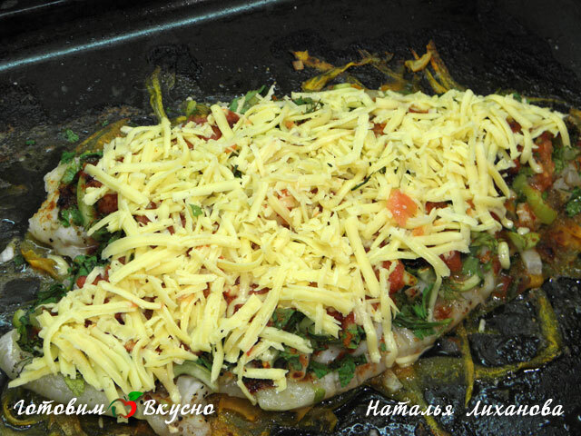 Подготовленную рыбу ставим в духовку на 30-40 мин при температуре 180 градусов. За пять минут до готовности посыпаем рыбу натертым сыром.