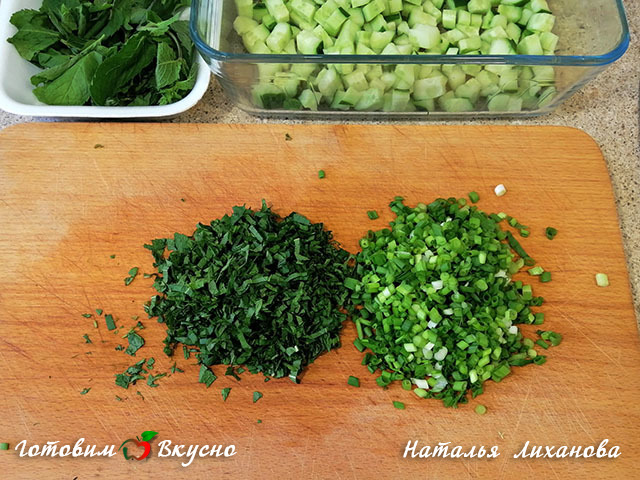 Мелко нарезаем лук и мяту. Добавляем их к огурцам.