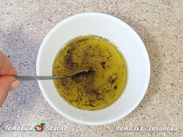Теперь приготовим заправку для салата. В небольшой емкости смешиваем мелко порезанный чеснок, оливковое масло, сок лимона, соль и перец.