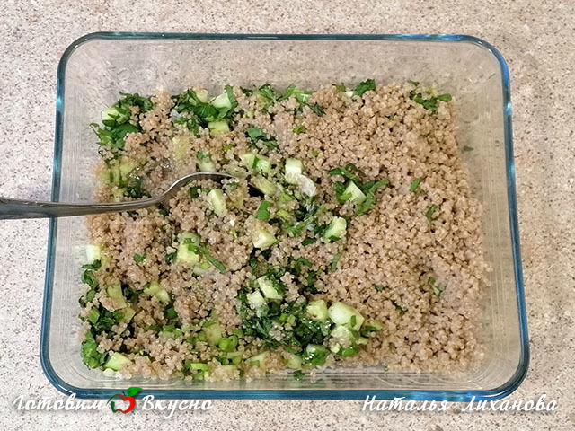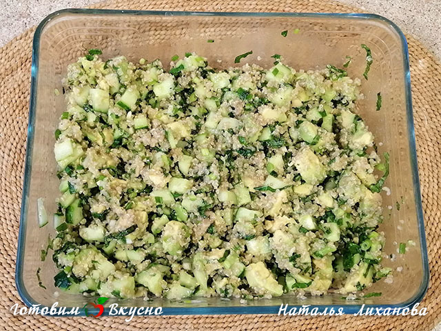 К огурцам и зелени добавляем киноа, заправку и перемешиваем.