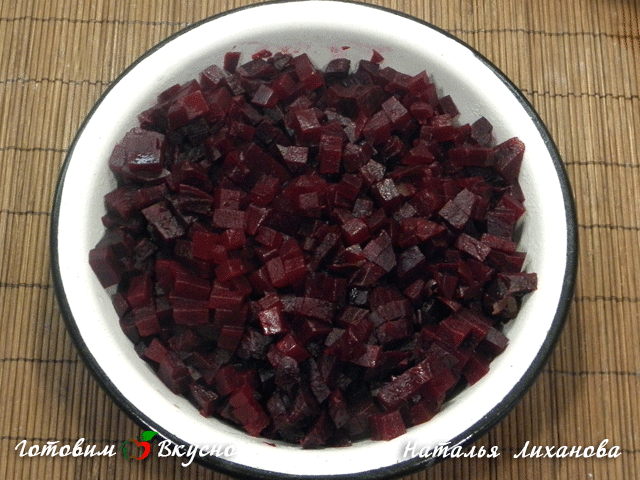 Чтобы приготовить салат из свеклы с копченой сельдью, свеклу отвариваем, чистим и нарезаем мелким кубиком.