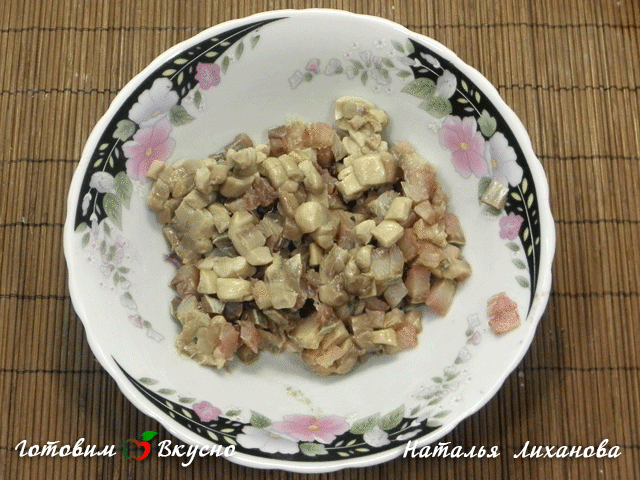 Сельдь чистим, отделяем мякоть, убираем все косточки и также нарезаем мелким кубиком.