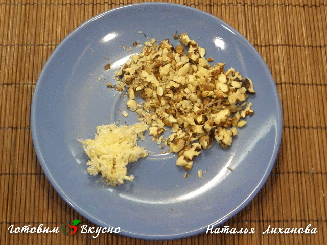 Чеснок натираем на мелкой терке, орехи рубим (не сильно мелко).
