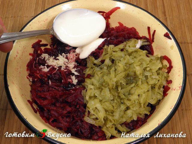 салат из свеклы с рыбными консервами в стаканы (или креманки) слоями: свекла, яйца, консервы. Присыпаем салат свежим укропом. Сверху для украшения я поставила пирамидки из вареной свеклы. Здесь можно пофантазировать и сделать украшение на свой вкус.