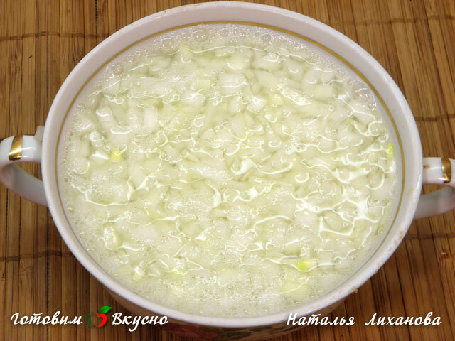 Нарезаем мелко лук, заливаем его кипятком и оставляем на 10 мин. Затем воду сливаем и промываем лук в холодной воде.