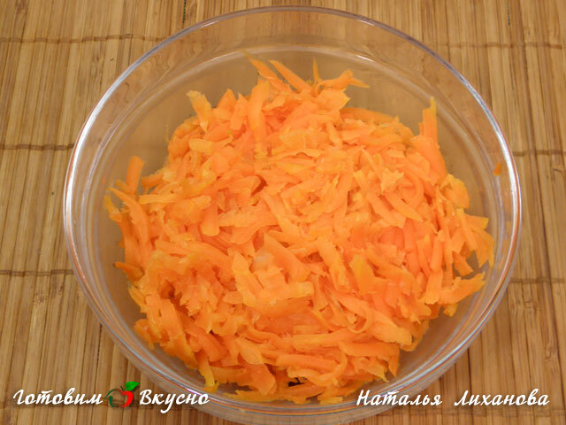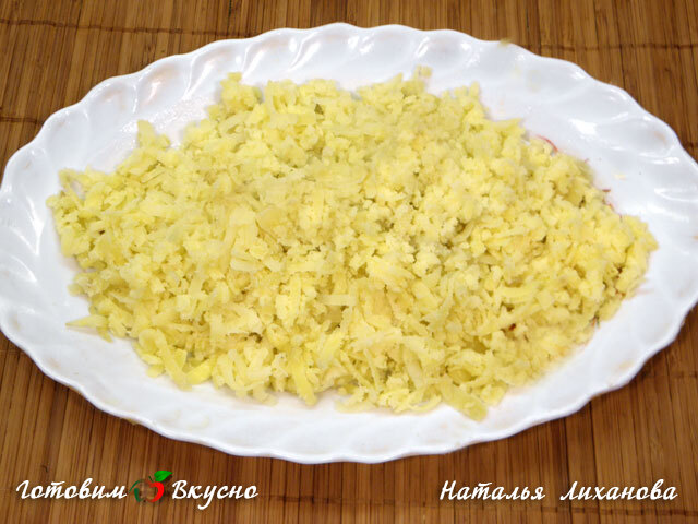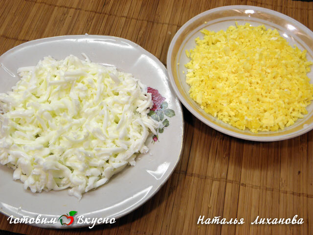 Отделяем белки от желтков и трем на мелкую терку желтки, на крупную - белки.