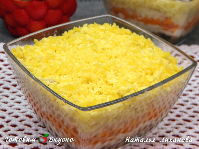 Теперь выкладываем подготовленные продукты в салатницу слоями, каждый слой смазываем майонезом: рыба, белки, морковь, лук, картофель и желтки. Последний слой (желтки) смазывать майонезом не нужно. Салат «Мимоза» готов!