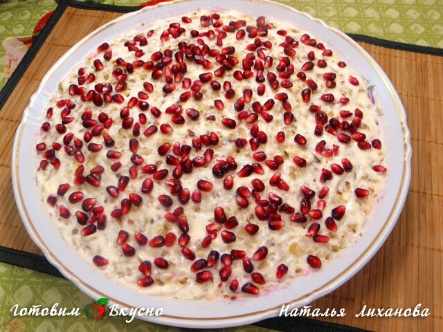 Далее, укладываем слоями в такой последовательности : картофель, свекла, морковь, изюм, сыр, орехи - каждый слой, смазывая майонезом. Последний слой - зерна граната.