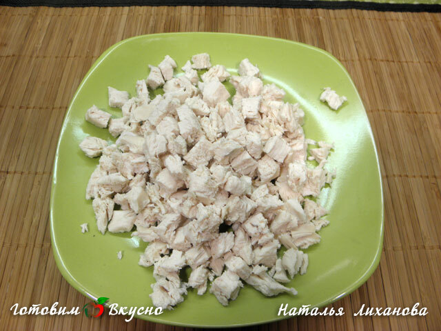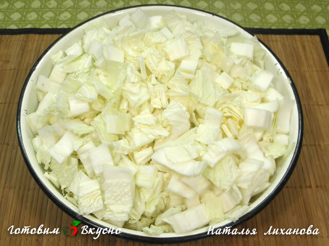Для приготовления салата с пекинской капустой, брынзой и курицей, капусту мелко шинкуем.