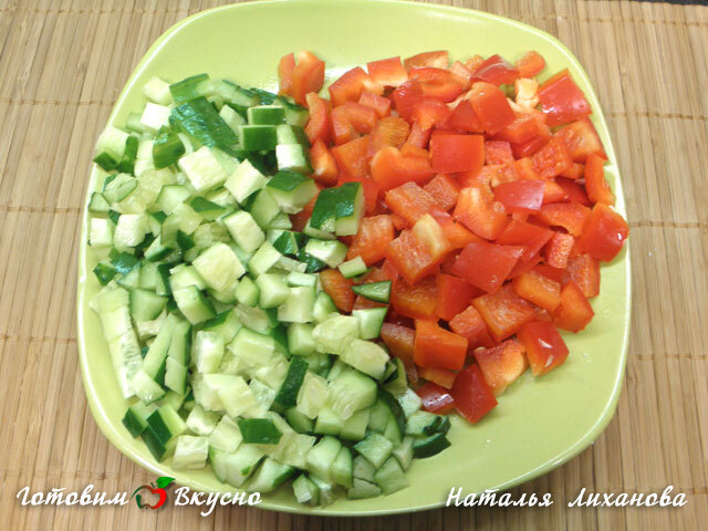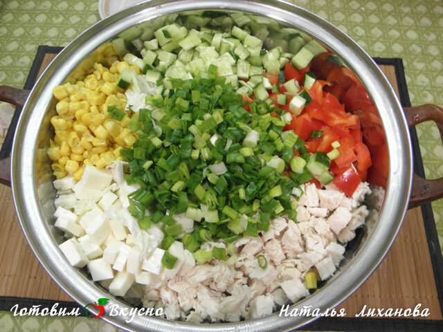 Все ингредиенты смешиваем, добавляем кукурузу, зеленый лук, майонез и лимонный сок. Солим и перчим по вкусу, перемешиваем.