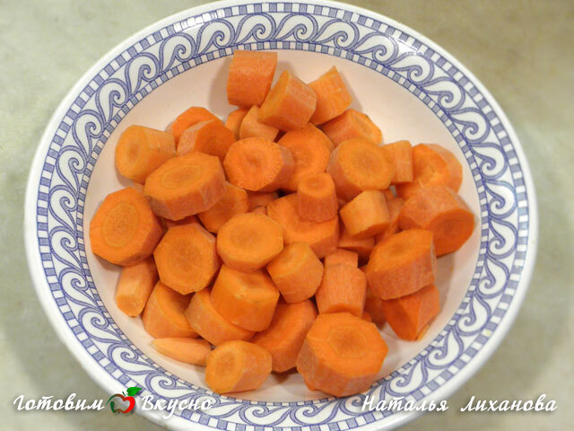 Чтобы приготовить салат витаминный, помытую и очищенную морковь нарезаем крупными кусочками.