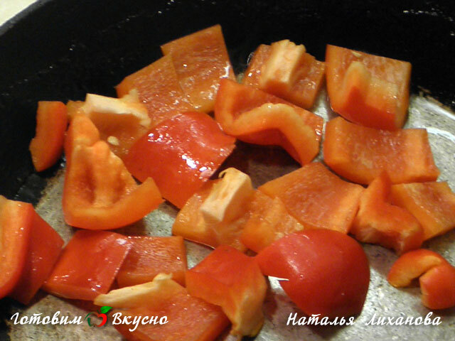 Болгарский перец очищаем от семян, нарезаем на кусочки и обжариваем на сковороде с небольшим количеством масла. Остужаем.