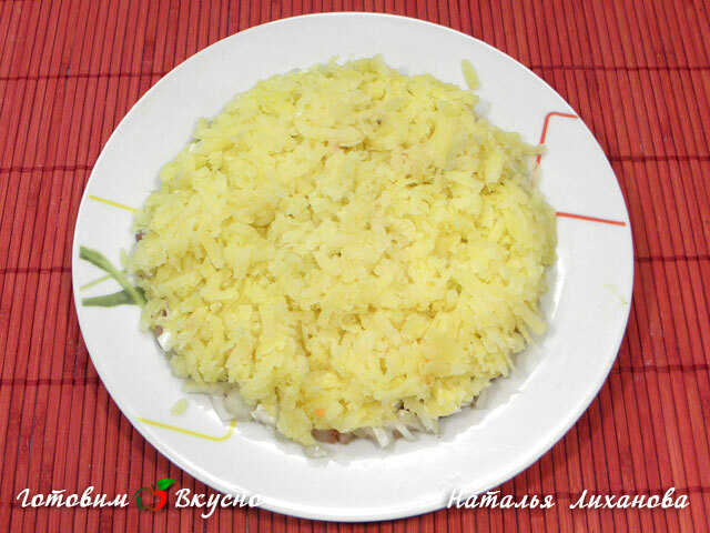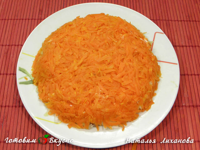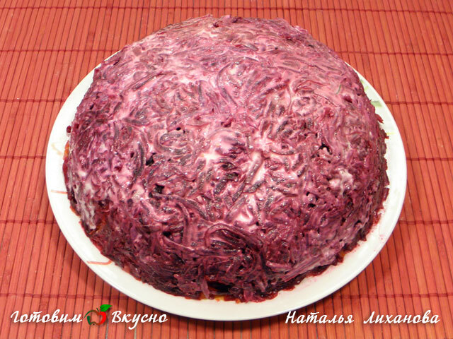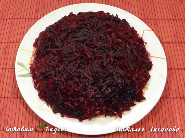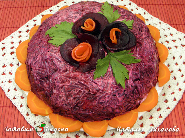 сельдь под шубой. Можно просто присыпать салат вареным и раскрошенным желтком. Я украсила салат, выложив по кругу дольки из вареной моркови. Свеклу (вареную) порезала на тонкие круглые лепесточки и свернула их в форме роз. Серединки, опять же, из моркови. «Букет» дополнительно украсила листьями петрушки. Настоящее праздничное блюдо!