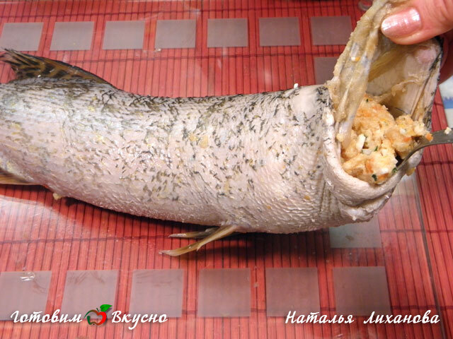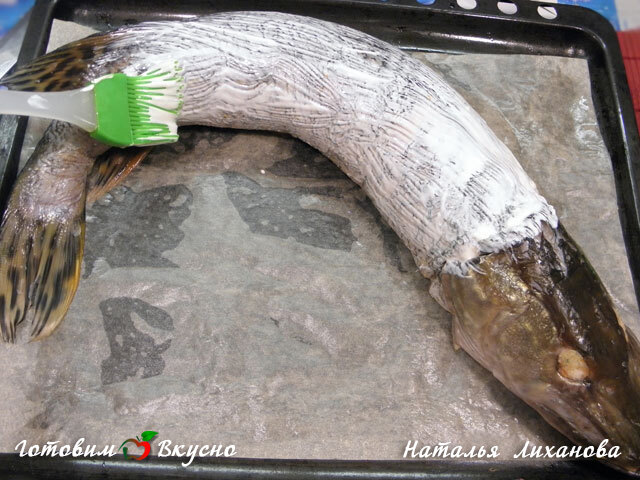 фаршированную щуку выкладываем на блюдо, она красиво смотрится на листьях салата. Украшаем блюдо. Я вставила в надрезы кусочки лимона, из лука сделала корону. При помощи майонеза на рыбе можно сделать красивый рисунок, у меня майонеза не нашлось. Я использовала сметану, добавила ягоды красной смородины (можно взять клюкву). Подаем рыбу со свежими овощами в холодном виде.