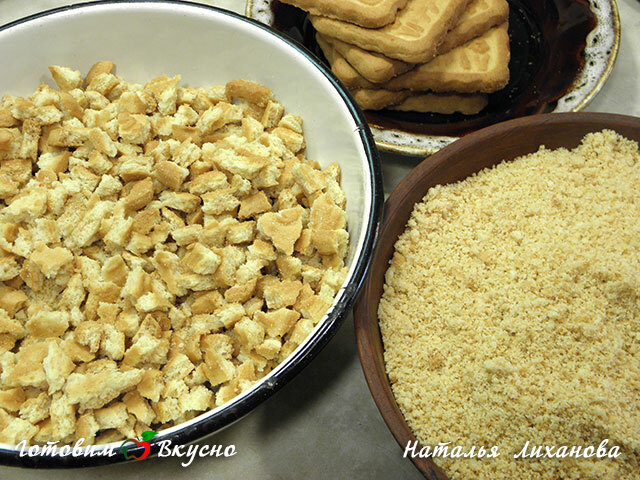 Чтобы приготовить шоколадную колбаску с печеньем и орехами половину печенья измельчаем при помощи блендера в порошок. Остальное ломаем на мелкие кусочки.