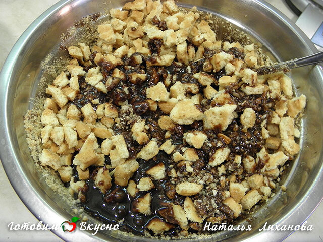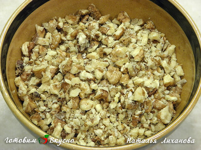 Орехи порубить так, чтобы были и мелкие и крупные части.