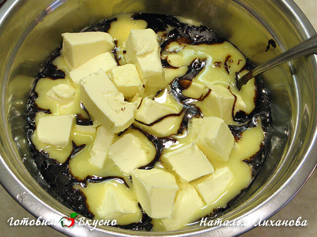 Ставим получившуюся смесь на слабый огонь и доводим до кипения, все время помешивая. Снимаем с огня и немного остужаем. Добавляем нарезанное кубиками сливочное масло.