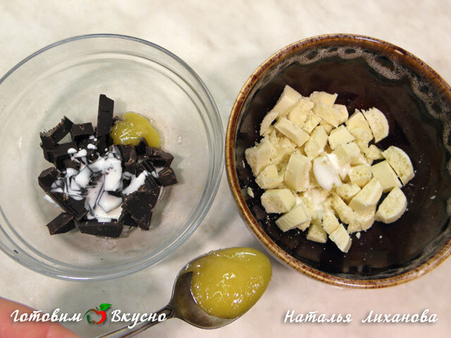 Для изготовления шоколадных пчел с миндальными крылышками белый и черный шоколад ломаем на мелкие кусочки и кладем в две мисочки. В каждую добавляем по чайной ложке сливок и по ½ ч. лож. меда.
