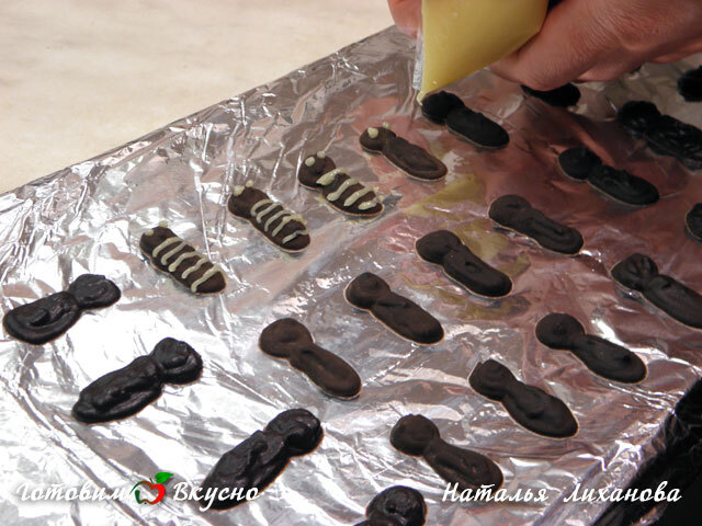 Белый шоколад также растапливаем, кладем в файл, делаем маленькую дырочку и рисуем на черных заготовках глазки и полоски.