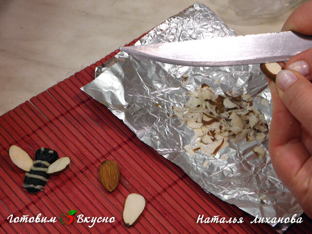 Из миндаля вырезаем крылышки. Острым ножом разрезаем миндаль на 2 половинки и аккуратно буквально выпиливаем ножом крылышко. Готовые крылышки втыкаем в пчел.