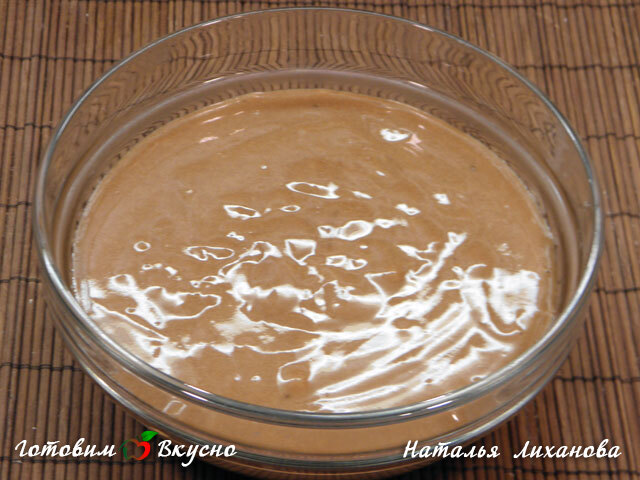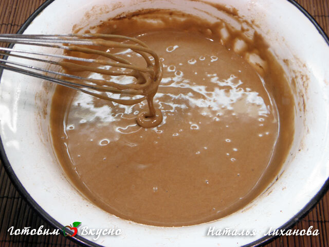 Добавляем остальные ингредиенты: какао, молоко, масло, муку и разрыхлитель. Все перемешиваем, тесто получается не густое.