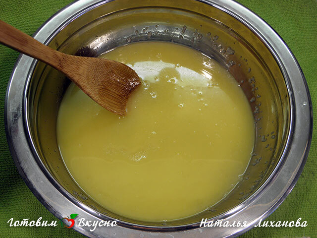 Для приготовления шоколадного торта с лимонным кремом из манки сливочное масло нужно растопить. Добавляем в него сахар и перемешиваем. Даем немного остыть.
