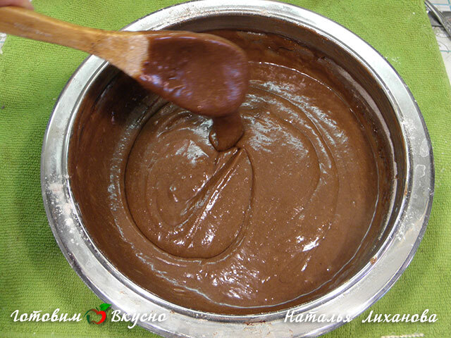 Затем добавляем гашеную соду и просеянную муку с какао. Все хорошенько перемешиваем. Тесто по консистенции будет как сметана.