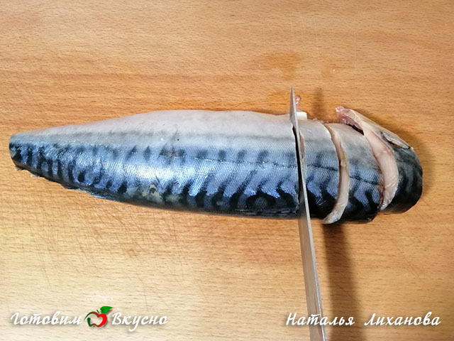 Для того чтобы приготовить скумбрию запеченную в духовке моем и чистим рыбу обычным способом (удалить голову, плавники, внутренности). Хорошо промываем рыбу, промакиваем бумажными полотенцами и нарезаем на кусочки толщиной 1,5 -2 см.