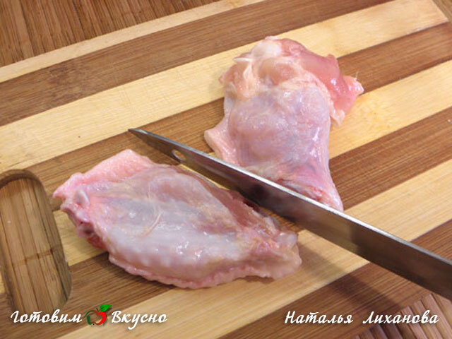Для приготовления сладких куриных крыльев разрезаем их пополам по суставу, последнюю фалангу отрезаем и убираем в холодильник для бульона. В таком виде крылья удобно и жарить и есть.