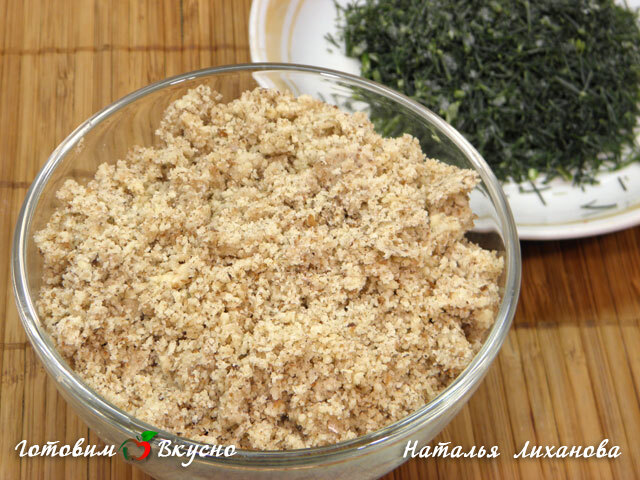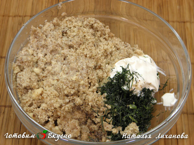 Для приготовления сметанно-орехового соуса, зелень мелко нарезаем. Грецкие орехи измельчаем, пропустив через мясорубку, или используем блендер.