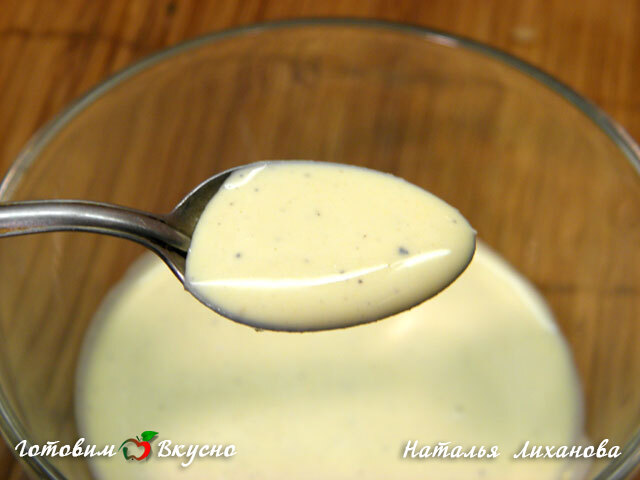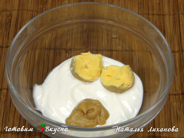Для приготовления сметанного соуса сметану, горчицу и желтки хорошенько перемешиваем, чтобы не было комочков.
