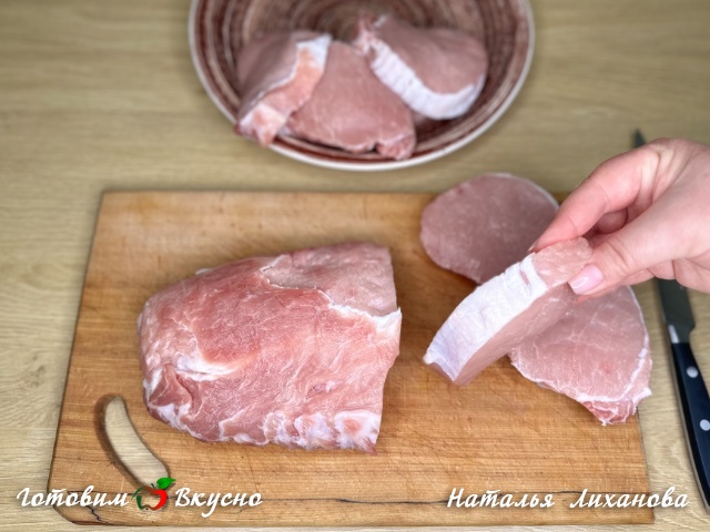 Для приготовления сочной свинины в духовке в первую очередь нарезаем мясо ломтиками толщиной 2 см.