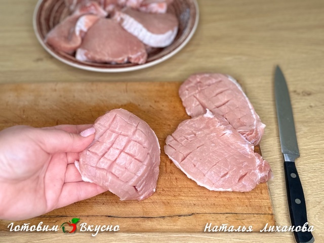 Затем с каждой стороны ломтика делаем неглубокие надрезы. Это нужно для того, чтобы мясо быстро промариновалось и было очень нежным.