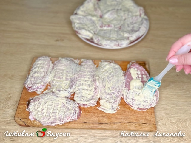 Каждый ломтик солим и перчим по вкусу. Затем смешиваем 3 ст. лож. сметаны и 1 ст. лож.горчицы и щедро смазываем кусочки мяса с двух сторон.