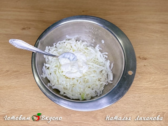 Теперь подготовим лук , я нарезала его тонкими полукольцами, добавляем немного соли, перца, 1 ст. лож. сметаны и 1 ч. лож лимонного сока. Все хорошенько перемешиваем.