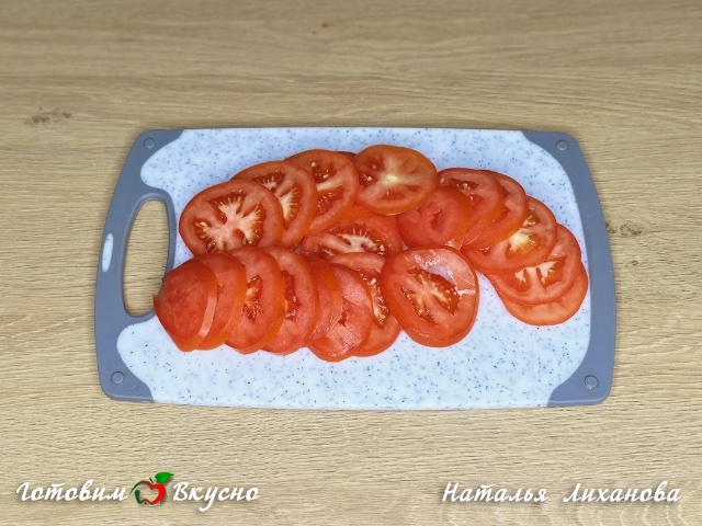 Помидоры нарезаем не слишком тонкими ломтиками.