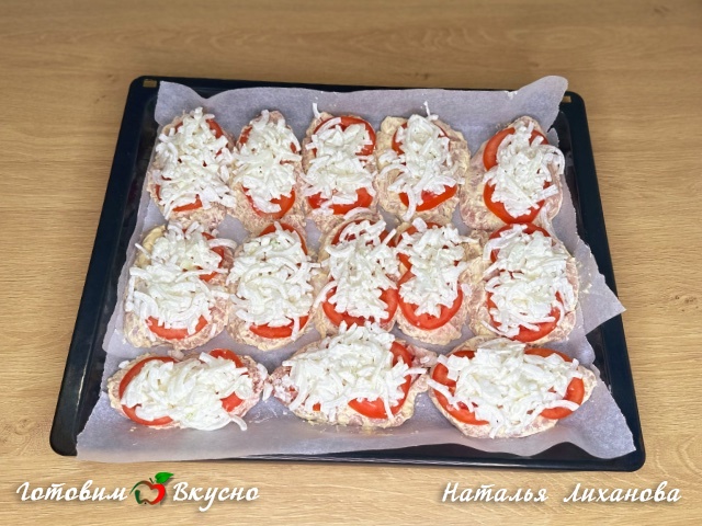 Выкладываем мясо на противень застеленный пергаментом для выпекания. Сверху каждого ломтика кладем два кружочка помидора, сверху помидор выкладываем лук. Ставим подготовленное мясо в разогретую до 190° С духовку на 35-40 минут.