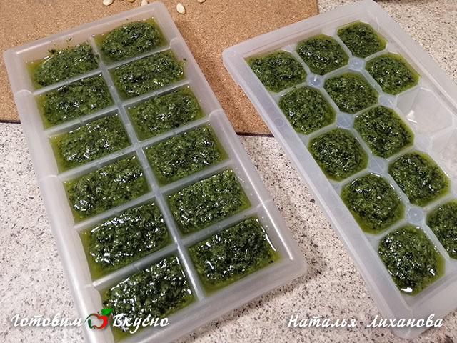 Еще соус песто можно замораживать, например в формах для льда. Когда соус замерзнет нужно аккуратно достать каждую секцию, сложить в пакет и хранить таким образом в морозилке.