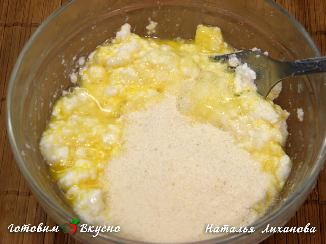 , взбиваем яйца, добавляем творог, манку, муку, соль. Все перемешиваем и оставляем минут на 30.